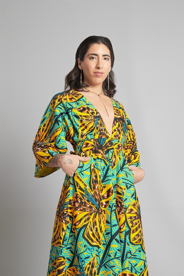 VESTIDO LARGO ESCOTE PROFUNDO EN V ,MANGAS ESTILO